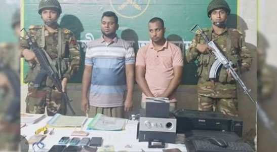 সাতক্ষীরায় অবৈধ জাল ডলার ও জাল টাকা ছাপানোর মেশিনসহ প্রতারক চক্রের দুই সদস্যকে গ্রেপ্তার করেছে যৌথ বাহিনী। শুক্রবার (২৩ মে) সন্ধ্যায় শহরের কাটিয়া এলাকা থেকে তাদের গ্রেপ্তার করা হয়। গ্রেপ্তারকৃতরা হচ্ছে, সাতক্ষীরার শ্যামনগর উপজেলার পশ্চিম বিড়ালক্ষ্মী গ্রামের আব্দুর রহিমের ছেলে মোহাম্মদ নাঈম হোসেন(৩০) ও একই উপজেলার কাটুলিয়া গ্রামের রফিকুল ইসলামের ছেলে আবু রাসেল(৩৫)। এ সময় তাদের কাছ থেকে ল্যাপটপ, প্রিন্টার, পাঞ্চ মেশিন, ১০ টা দেশের জাল মুদ্রাসহ বিভিন্ন ধরনের মালামাল উদ্ধার করে যৌথ বাহিনী। জানা যায়, গোপন সংবাদের ভিত্তিতে সাতক্ষীরা সদর সেনা ক্যাম্পের ৩৭ বীর সিনিয়র ওয়ারেন্ট অফিসার আলমগীর এর নেতৃত্বে শহরের কাটিয়া এলাকার আশরাফুল ইসলামের বাড়িতে অভিযান চালান যৌথ বাহিনীর সদস্যরা। এসময় জাল ডলার ও জাল টাকা ছাপানো চক্রের দুই সদস্যকে গ্রেপ্তার করা হয়। এসময় সেখান থেকে বিদেশি জাল মুদ্রা, জাল ডলার ও জাল টাকা ছাপানোর মেশিনসহ বিভিন্ন ধরনের মালামাল উদ্ধার করা হয়। এবিষয়ে আরো তথ্য উদঘাটনে গ্রেপ্তারকৃতদের সাতক্ষীরা সেনা ক্যাম্পে জিজ্ঞাসাবাদ করা হচ্ছে বলে জানা গেছে। সাতক্ষীরা যৌথ বাহিনী একটি নির্ভরযোগ্য সূত্র তথ্য নিশ্চিত করেছে।