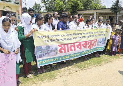 ময়মনসিংহের ভালুকা উপজেলার ধীতপুর ইউনিয়নের রান্দিয়া সরকারি প্রাথমিক বিদ্যালয় ও রান্দিয়া উচ্চ বিদ্যালয়ের মাঝ দিয়ে যাওয়া পাকা সড়ক স্থায়ীভাবে বন্ধের দাবিতে মানববন্ধন অনুষ্ঠিত হয়েছে। শনিবার (২৪ মে) সকাল ১০টায় বিদ্যালয় প্রাঙ্গণে এ মানববন্ধনের আয়োজন করেন বিদ্যালয়ের শিক্ষক, শিক্ষার্থী, অভিভাবক এবং স্থানীয় বাসিন্দারা। মানববন্ধনে বক্তারা জানান, মাঝখানে পাকা রাস্তা থাকায় স্কুল মাঠ বিভক্ত হয়ে পড়েছে। ফলে শিক্ষার্থীরা খেলার উপযুক্ত পরিবেশ থেকে বঞ্চিত হচ্ছে। পাশাপাশি যানবাহন চলাচলের কারণে প্রতিনিয়ত দুর্ঘটনার শঙ্কায় থাকতে হচ্ছে। মানববন্ধনে বক্তব্য রাখেন স্থানীয় ইউপি সদস্য খন্দকার শানিমুল হাসান, রান্দিয়া উচ্চ বিদ্যালয়ের প্রধান শিক্ষক রুহুল আমিন খান এবং রান্দিয়া সরকারি প্রাথমিক বিদ্যালয়ের প্রধান শিক্ষক নাছিমা খানম। বক্তারা বলেন, বিদ্যালয়ের পেছনে বিকল্প রাস্তা থাকলেও সেটি ব্যবহার না করে স্কুল মাঠের মাঝখান দিয়ে চলাচল করে। এতে শিক্ষার পরিবেশ বিঘিœত হচ্ছে এবং শিক্ষার্থীদের নিরাপত্তা হুমকির মুখে পড়ছে। গত রমজানেও এক শিক্ষার্থী সড়ক দুর্ঘটনার শিকার হয়েছিল। তারা অভিযোগ করে বলেন, বিষয়টি একাধিকবার স্থানীয় প্রশাসনকে অবহিত করা হলেও আজও কার্যকর কোনো পদক্ষেপ নেওয়া হয়নি। তাই যদি দ্রুত সময়ের মধ্যে রাস্তা বন্ধ করে নিরাপদ শিক্ষাবান্ধব পরিবেশ নিশ্চিত না করা হয়, তাহলে এলাকাবাসী নিজেরাই রাস্তা বন্ধ করে অবস্থান কর্মসূচি পালন করবেন।