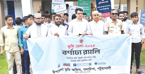 নিয়মিত ভূমি উন্নয়ন কর প্রদান করি, নিজের জমি সুরক্ষিত রাখি। এই প্রতিপাদের আলোকে-সারা দেশের ন্যায় গলাচিপ উপজেলা ভূমি অফিসের আয়োজনে-রবিবার সকাল ১০ ঘটিকায় উপজেলা ভূমি অফিস চত্বর থেকে এক বর্ণাঢ্য বাদ্যযন্ত্র নিয়ে ব্যানার -প্লেকার্ড শোভা করে জনসচেতনতায় একটি রেল মিছিল বের করে। রেলি শেষে সরকারি কমিশনার ভূমি অফিস হলরুমে এক আলোচনা সভা ও শিক্ষার্থীদের নিয়ে কুইজ প্রতিযোগিতা অনুষ্ঠিত হয়। সবাই সভাপতিত্ব ও ভূমি মেলা উদ্বোধন করেন পটুয়াখালী সদর সহকারী কমিশনার ভূমি ও নির্বাহী ম্যাজিস্ট্রেট মারজুক রহমান রিফাত। বক্তব্য রাখেন গণধিকারের আয়বায়ক মোঃ হাফিজুর রহমান, জামাতের আমির মোঃ জাকির হোসেন, প্রেসক্লাব সভাপতি মু: খালিদ হোসেন মিল্টন, গণধিকারের সদস্য সচিব মোঃ জাকির মুন্সি। অনুষ্ঠানে-বিভিন্ন এলাকার জনসাধারণ সমাজসেবক, গণমাধ্যম কর্মীসহ স্কুল শিক্ষক শিক্ষার্থী বৃন্দ। সভায় সভাপতি বলেন ভূমি ব্যবস্থাপনা আদি যুগ থেকে ভূমিকর প্রদান সহ নানা জটিলতা দূর করতে বর্তমান সরকার-নামজারি ও জমা খারিজ দ্বারা মালিকানার স্বীকৃতি সহ অনলাইন সেবায় ভূমিকর সহ সকল প্রকার সেবা প্রদান করা হয়। আগামী ৩০ জুন/২৫ পর্যন্ত ভূমি মেলা ও ভূমি সেবা কার্যক্রম চলবে।