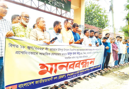 কুড়িগ্রামের উলিপুরে বিএনপি নেতা আব্দুর রশিদ সরকারের বিরুদ্ধে সামাজিক যোগাযোগ মাধ্যমে উদ্দেশ্যে প্রণদিত ভাবে মিথ্যা ও ভিত্তিহীন তথ্য প্রচার করে সামাজিক মর্যাদা ক্ষুন্ন করার প্রতিবাদে মানববন্ধন অনুষ্ঠিত হয়েছে। শনিবার (২১ জুন) বিকালে উপজেলা বিএনপি কার্যালয়ের সামনে উপজেলা ও পৌর বিএনপির আয়োজনে মানববন্ধন হয়। মানববন্ধন চলাকালে বক্তব্য রাখেন, উপজেলা বিএনপির যুগ্ম আহবায়ক ওবায়দুর রহমান বুলবুল, আব্দুর রশিদ সরকার ও এরশাদুল হাবীব নয়ন প্রমুখ। এ সময় বক্তারা বলেন, ২০২১ সালের ২৬ জানুয়ারী পৌর নির্বাচনের সময় বিএনপি নেতা আব্দুর রশিদ প্রচারনা শেষে রাতে বাড়ি ফেরার পথে উলিপুর বাজারে আটক তাকে করে ছাত্রলীগ ও যুবলীগের নেতাকর্মীরা মারধর করেন। এ সময় তার ব্যবহৃত মোবাইল ফোনটি কেড়ে নিয়ে বিএনপির প্রার্থীর পক্ষে টাকার বিনিময়ে ভোট কেনার মিথ্যা অভিযোগ তুলে পুলিশে সোর্পদ করেন। পরবর্তীতে তিনি জেলে থাকা কালীন সময়ে ছাত্রলীগ ও যুবলীগের নেতাকর্মীরা ওই মোবাইল ফোনে আব্দুর রশিদের ফেসবুক আইডি ব্যবহার করে বিএনপি প্রার্থী ও দলের বিরুদ্ধে বিভিন্ন ধরনের পোষ্ট করেন। এদিকে ১৮ জুন মাসুদ রানা বাবু নামের এক যুবক আব্দুর রশিদের আইডি ব্যবহার করে ওই সময়ের দেয়া পোষ্টের স্কিনশর্ট গুলো নতুন করে ফেসবুকে শেয়ার করে তা ছড়িয়ে দেন। উপজেলা বিএনপির যুগ্ম আহবায়ক আব্দুর রশিদ সরকারের বিরুদ্ধে উদ্দেশ্য প্রণদিত মিথ্যা অপপ্রচার করে সামাজিক ভাবে মর্যাদা ক্ষুন্ন করায় তীব্র নিন্দা ও প্রতিবাদ জানান বিএনপি নেতৃবৃন্দ। তারা বলেন, বর্তমানে যারা ওই স্কিনশট ব্যবহার করে ফেসবুকে শেয়ার করছেন, তারাও ওই হামলার সাথে জড়িত ছিল। বর্তমানে দলের ভাবমুর্তি নষ্ট করার জন্য নেতাদের নামে তারাই অপপ্রচার চালাচ্ছে। মাসুদ রানা বাবু স্কিনশর্টের সাথে ক্যাপশন হিসাবে উল্লেখ করেন দীর্ঘ সময় উলিপুর উপজেলা ভবন বিএনপির সাইনবোর্ড ঝুলিয়ে উলিপুর উপজেলার সাবেক মেয়র, সাবেক উপজেলা চেয়ারম্যান, সাবেক উলিপুর ভবন বিএনপির সভাপতি এবং উলিপুর উপজেলা বিএনপির আহবায়ক কমিটির সদস্য সচিবের ভোট কেনাসহ বিভিন্ন অপকর্মে লিপ্ত, বিভিন্ন দুর্নীতিতে চ্যাম্পিয়ন, উলিপুর উপজেলা ভবন বিএনপির নিজ দলের নেতাকর্মীদের কাছে লাঞ্চিত হয়ে দল থেকে অব্যাহতি দিয়ে জনতার কাতারে সিদ্ধান্ত নিয়ে নিজেকে শহীদ জিয়াউর রহমানের আদর্শের সৈনিক হিসাবে নিজেকে দাড় করানোর চেষ্টায় ব্যস্ত এবং তার নিজ আইডি থেকে সামাজিক যোগাযোগ মাধ্যম ফেসবুকে হৃদয় বিদারক পোষ্ট, আপনার এই সিদ্ধান্তকে সাধুবাদ জানাই আব্দুর রশিদ মেলেটারী চাচা। এ বিষয়ে মুঠোফোনে যোগাযোগ করা হলে মাসুদ রানা বাবু নিজেকে বিএনপির কর্মী হিসাবে দাবী করে বলেন, আমি মিথ্যা কোন পোষ্ট ক