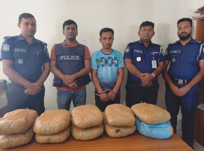 কমলগঞ্জ থানা পুলিশের বিশেষ অভিযানে ১০ কেজি গাঁজাসহ এক মাদক কারবারি আটক করা হয়েছে। মঙ্গলবার (২৪ জুন) সকাল আনুমানিক সাড়ে ১১ ঘটিকার সময় কমলগঞ্জ উপজেলার শমসেরনগর ইউনিয়নের সুনছড়া চা বাগান (ডবলছড়া) বটগাছ লাইন এলাকায় কমলগঞ্জ থানার অফিসার ইনচার্জ আবু জাফর মোঃ মাহফুজুল কবির, এসআই আমির উদ্দিনসহ একটি টিম অভিযান পরিচালনা করে। এসময় স্থানীয় জনতার সহায়তায় রাজেশ নেপালী (৩৫), পিতা- লাল বাহাদুর নেপালীকে তার বাড়ি থেকে আটক করা হয়। তার বসতঘরে তল্লাশি করে ১০ টি প্যাকেটে স্কচটেপ দিয়ে মোড়ানো ১০ (দশ) কেজি গাঁজা জব্দ করা হয়। কমলগঞ্জ থানার অফিসার ইনচার্জ আবু জাফর মোঃ মাহফুজুল কবির বলেন, মাদকের বিরুদ্ধে জিরো টলারেন্স নীতিতে আমরা কঠোরভাবে কাজ করছি। প্রাপ্ত গোপন সংবাদের ভিত্তিতে অভিযান চালিয়ে রাজেশ নেপালীকে তার ঘর থেকে ১০ কেজি গাঁজাসহ আটক করা হয়েছে। তার বিরুদ্ধে মাদকদ্রব্য নিয়ন্ত্রণ আইনে নিয়মিত মামলা দায়েরের প্রস্তুতি চলছে। আমাদের এ ধরনের অভিযান অব্যাহত থাকবে।