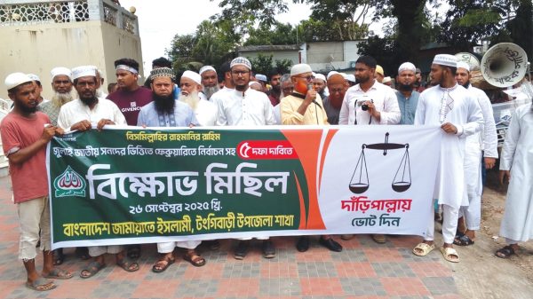 জুলাই জাতীয় সনদের ভিত্তিতে এবং পিআর পদ্ধতিতে জাতীয় সংসদ নির্বাচনসহ পাঁচ দফা দাবিতে মুন্সীগঞ্জের টঙ্গীবাড়ীতে বিক্ষোভ মিছিল করেছে বাংলাদেশ জামায়াত ইসলাম। শুক্রবার (২৬ সেপ্টেম্বর) বেলা ১১ টায় উপজেলা মডেল মসজিদ থেকে মিছিল টি শুরু হয়ে উপজেলার প্রধান প্রধান সড়ক প্রদক্ষিণ করে মুক্তিযোদ্ধা কমপ্লেক্সে গিয়ে শেষ হয়। কেন্দ্রীয় কর্মসূচির অংশ হিসেবে বিক্ষোভ মিছিল বের করে দলটি। উপজেলা জামায়াত আমীর মাওলানা হাবিবুর রহমান এর সভাপতিত্বে এসময় প্রধান অতিথি হিসেবে উপস্থিত ছিলেন বাংলাদেশ জামায়াতে ইসলামী মুন্সিগঞ্জের ২ (টঙ্গীবাড়ী-লৌহজং) নির্বাচনি আসনের মনোনীত সংসদ সদস্য প্রার্থী অধ্যাপক এ বি এম ফজলুল করিম। অন্যান্যদের মধ্যে আরো উপস্থিত ছিলেন মুন্সীগঞ্জ জেলা মজলিসে শুরা সদস্য মাওলানা এম.এ.বারী, মুন্সিগঞ্জ জেলা এডুকেশন সোসাইটি সভাপতি মাওলানা হেমায়েতউদ্দীন, উপজেলা সেক্রেটারি মাওলানা মোঃ ইকবাল হোসাইনসহ উপজেলা ও বিভিন্ন ইউনিয়নের নেতৃবৃন্দ। এ সময় বক্তারা বলেন’ ২৪ গণঅভ্যুত্থানে হাজারো মানুষ শহিদ ও আহত হলেও আজ পর্যন্ত জুলাই সনদ ঘোষণা করা হয়নি। নির্বাচনের আগে জুলাই সনদ বাস্তবায়ন করতে হবে। এ ছাড়া, পিআর পদ্ধতিতে নির্বাচন না দিলে কোনো নির্বাচন করতে দেওয়া হবে না বলে হুঁশিয়ারি দেন জামায়াত ইসলামী নেতারা।