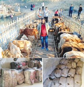 সুনামগঞ্জ সদর উপজেলায় পুলিশের অভিযানে ৩১টি ভারতীয় গরু,একটি ষ্টিল বডি নৌকাসহ ২ জনকে আটক করা হয়েছে। বুধবার (১৭ ডিসেম্বর) বিকেল ৫টার দিকে সুনামগঞ্জ সদর থানাধীন সুরমা নদী দিয়ে পাচারকালে গোপন সংবাদের ভিত্তিতে পুলিশের অভিযানে জেলার দোয়ারাবাজার উপজেলার ভারতীয় সীমান্ত দিয়ে আসা অবৈধ গরুর চালানের ৩১টি ভারতীয় গরু এবং বহনকারী একটি ষ্টিল বডি নৌকাসহ ২ জনকে আটক করা হয়। আটককৃতরা হচ্ছেন জেলার দোয়ারাবাজার থানার নরসিংহপুর ইউনিয়নের নরসিংহপুর গ্রামের ছেরাগ আলীর ছেলে আনছার আলী(৩০) ও তার সহোদর আশিক মিয়া(২০)। জানা যায়, দেশের ভেতরে নিয়ে আসার পর চোরাকারবারীরা অবৈধ ৩১টি গরুর চালান নৌকাযোগে সুরমা নদী দিয়ে সুনামগঞ্জ হয়ে জামালগঞ্জের জয়নগর বাজার দিয়ে যাওয়ার পথে চোরাই গরুসহ নৌকাটি আটক করে সদর থানা পুলিশের একটি টহল দল। আটককৃত গরুগুলো পরে সন্ধা ৭ টায় স্থানীয় লঞ্চঘাট পুলিশ ফাড়িঁতে নিয়ে আসা হয়। সুনামগঞ্জ সদর থানার ওসি তদন্ত মোঃ আরিফ উল্লাহ, এসআই মাহমুদুল হাসান, এএসআই মোঃ খাদেমুল ইসলাম (খাদেম) সহ পুলিশ সদস্যরা এই অভিযানে অংশ গ্রহন করেন। আটককৃত গরুগুলো সনাক্ত করার জন্য কাস্টম অফিসার এবং প্রাণী সম্পদ অধিদপ্তরের কর্মকর্তাদের অবগত করে তাদের সমন্বয়ে আইনগত ব্যবস্থা গ্রহন করা হবে বলে জানান সদর মডেল থানার ওসি রতন শেখ। একই দিনে অপর এক অভিযানে সদর থানাধীন ১নং রঙ্গারচর ইউনিয়নের বল্লভপুর গ্রাম সংলঘœ ইট ভাটার পাশে ধান ক্ষেত হতে পরিত্যক্ত অবস্থায় ২ হাজার ৩০০পিছ ভারতীয় কাস্মীরি শাল চাদর, ১ শত ৩১ পিছ ইন্ডিয়ান শেরওয়ানি, ১০টি ওয়ানপিছ মেয়েদের ইন্ডিয়ান জামাসহ বিপুল পরিমান ভারতীয় পণ্য উদ্ধার করা হয়। স্থানীয়রা জানান, জেলার সীমান্তবর্তী দোয়ারাবাজার উপজেলায় আইন শৃংখলা বাহিনীর চোখ ফাঁকি দিয়ে প্রতিনিয়ত ভারত থেকে অবৈধভাবে আমদানী করা গরু, মাদক ও কসমেটিকসহ বিভিন্ন ধরনের পণ্য দেশের ভেতরে নিয়ে আসে চোরাকারবারী সিন্ডিকেট। এসব তথ্য জানার পর অবৈধ চোরাকারবারিদের বিরুদ্ধে পুলিশের অভিযান অব্যাহত রয়েছে এবং আটককৃত মালামালসহ জড়িতদের বিরুদ্ধে আইনগত ব্যবস্থা গ্রহন করা হচ্ছে বলেও জানান সদর থানার ওসি মোহাম্মদ রতন শেখ।