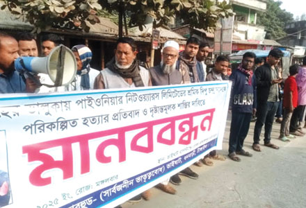 টাঙ্গাইল জেলাধীন ধনবাড়ী উপজেলার বাইঘাট বাজার বাস স্ট্যান্ড চত্বরে গতকাল বিকেল চার ঘটিকায়’’ ইউনিভার্সাল ব্রাদারহুডের’’ ব্যানারে মানববন্ধন অনুষ্ঠিত হয়। গত ১৮-১২- ২০২৫ ইং রাত ৯ টায় ভালুকা পাইনিয়ার নিটওয়্যারস লিমিটেডের শ্রমিক দিপু দাসের হত্যার প্রতিবাদে বাইঘাট বাজার হিন্দু-মুসলিম কর্তৃক সর্বজনীন ভাতৃত্ব সংগঠন ইউনিভার্সেল ব্রাদারহুড এর মাধ্যমে প্রতিবাদ সভা ও মানববন্ধন করা হয়। উক্ত সংগঠনের মুখপাত্র ধনবাড়ী উপজেলা বাংলাদেশ জামায়াতে ইসলামী যুব বিভাগের সভাপতি জননেতা মিনহাজ আলী বলেন-বাংলাদেশের মানুষ হিন্দু বৌদ্ধ এবং খ্রিষ্টান যার যার স্ব-স্ব ধর্ম শান্তিপূর্ণভাবে পালন করে যাচ্ছে কিছু উচক্রী মহল দেশকে অস্থিতিশীল করার জন্য পূর্বের ফ্যাসিস্টদের ধারাবাহিকতায় গভীর ষড়যন্ত্রে লিপ্ত হচ্ছে। বাংলাদেশের শান্তি প্রিয় মানুষ এ ষড়যন্ত্রকে রুখে দাঁড়াবে আগামী ১২ ফেব্রুয়ারি ২০২৬ইং নির্বাচনের মাধ্যমে। ভাইঘাট বাজার ইউনির্ভাসাল ব্রাদারহুড এর সেক্রেটারি এবং পূজা উদযাপন কমিটির সভাপতি পরেশ চন্দ্র বলেন বাংলাদেশের জন্ম লগ্ন থেকে আমরা মুসলিম এবং হিন্দু পরিবার মিলে মিশে বসবাস করে যাচ্ছি. আমাদের এই বসবাসকে অস্থিতিশীল পরিবেশ সৃষ্টি করার জন্য একটি মহল আমাদের এই শান্তি কে বিনষ্ট করে দিচ্ছে। সরকারের কাছে জোর দাবি জানাচ্ছি অবিলম্বে দিপু হত্যার বিচার এবং চিহ্নিত লোককে আসামি করে বিচারের কাঠগড়ায় দাঁড় করানো হোক। তিনি আরো বলেন বাংলাদেশের একটি গোষ্ঠী একটি মহলকে বিপদে ফেলানোর জন্য এই হত্যাকান্ড ঘটিয়েছে সুষ্ঠু তদন্ত হলে মূল হত্যাকারী বের হয়ে আসবে বলে আমি মনে করি। বাংলাদেশের মানুষ আইনের উর্ধ্বে কেউ নয়, সঠিক বিচার হলে দ্বিতীয়বার এ ধরনের হত্যাকা- করার মত কেউ সাহস পাবে না। উক্ত মানববন্ধনে উপস্থিত ছিলেন ধনবাড়ী উপজেলা প্রেসক্লাবের সাংগঠনিক সম্পাদক এনটিভির ধনবাডী প্রতিনিধি মোঃ হাফিজুর রহমান। মধুপুর উপজেলা প্রেসক্লাবের সহ-সভাপতি মাওলানা আমিনুল ইসলাম মারুফী, টাঙ্গাইল জেলা ছাত্র অধিকার পরিষদের সহ-সভাপতি মোহাম্মদ মাহমুদ হাসান মিলন ও দিপু সূত্রধর প্রমুখ।