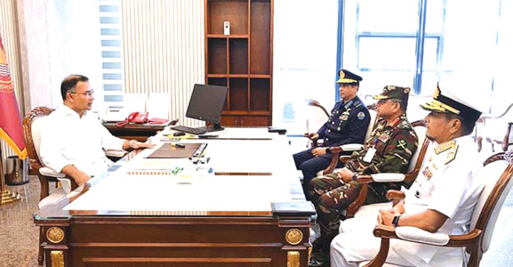 গতকাল বৃহস্পতিবার সকালে তাঁর সঙ্গে সৌজন্য সাক্ষাৎ করেন সেনাবাহিনী প্রধান জেনারেল ওয়াকার-উজ-জামান, নৌবাহিনী প্রধান অ্যাডমিরাল মোহাম্মদ নাজমুল হাসান এবং বিমানবাহিনী প্রধান এয়ার চিফ মার্শাল হাসান মাহমুদ খাঁন।