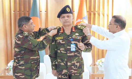 আন্ত:বাহিনী জনসংযোগ পরিদপ্তরের (আইএসপিআর) এক সংবাদ বিজ্ঞপ্তিতে এ তথ্য জানিয়েছে। সশস্ত্র বাহিনী বিভাগে প্রধানমন্ত্রী তারেক রহমান নবনিযুক্ত প্রিন্সিপাল স্টাফ অফিসারকে লেফটেন্যান্ট জেনারেল র্যাংক ব্যাজ পরিয়ে দেন। ছবি: বাসস