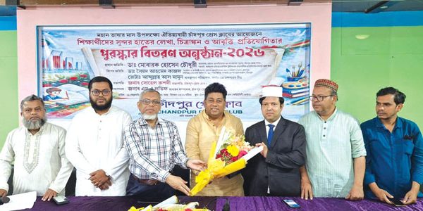 গতকাল চাঁদপুর প্রেসক্লাবের আয়োজনে প্রেস ক্লাব ভবনের নিচতলায় কমিউনিটি সেন্টারে মহান ভাষার মাস উপলক্ষে শিক্ষার্থীদের সুন্দর হাতে লেখা, চিত্রাঙ্কন ও আবৃত্তি প্রতিযোগিতার সমাপনী পুরস্কার বিতরণ অনুষ্ঠিত হয়েছে। অনুষ্ঠানে প্রধান অতিথির বক্তব্য রাখেন ড্যাব চাঁদপুর জেলা শাখার আহ্বায়ক ডা: মোবারক হোসেন চৌধুরী। বিশেষ অতিথি হিসেবে বক্তব্য রাখেন ২৫০ চাঁদপুর সরকারি জেনারেল হাসপাতােেল সিনিয়র মেডিকেল অফিসার ডা: সৈয়দ আহমেদ কাজল কাজল, কর্নার ডেবেলপারর্স লি: ব্যবস্থাপনা পরিচালক রোটারিয়ান আব্দুল্লাহ আল মামুন। সভাপতিত্ব করেন চাঁদপুর প্রেসক্লাবের সভাপতি সোহেল রুশদী। পরিচারনা করেন চাঁদপুর প্রেসক্লাবের সাধারণ সম্পাদক এম এ লতিফ। এসময় অন্যান্য অতিথিবৃন্দগণ ও উপকমিটির সদস্যবৃন্দ বক্তব্য রাখেন ও উপস্থিত ছিলেন।