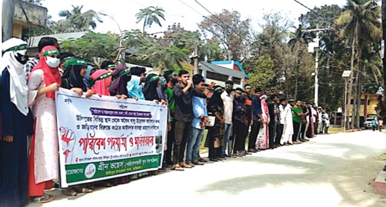 কুড়িগ্রামের উলিপুরে তিস্তা নদী থেকে অবৈধভাবে বালু উত্তোলনের প্রতিবাদে বিক্ষোভ মিছিল ও মানববন্ধন করেছে স্বেচ্ছাসেবী নামে এক সংগঠন গ্রীন ভয়েস। কুড়িগ্রামের উলিপুর উপজেলায় বিভিন্ন ইউনিয়নে রাজনৈতিক প্রভাব খাটিয়ে তিস্তা নদী থেকে অবৈধভাবে বালু উত্তোলনের প্রতিবাদে রবিবার (০১ মার্চ) উপজেলা শহীদ মিনার (বিজয় মঞ্চ) চত্বর থেকে একটি বিক্ষোভ মিছিল বের হয়। মিছিলটি উপজেলার প্রধান প্রধান সড়ক প্রদক্ষিণ শেষে উপজেলা চত্বরে এসে শেষ হয়।এসময় মানববন্ধনে বক্তব্য রাখেন গ্রীন ভয়েস কুড়িগ্রাম জেলা শাখার সভাপতি নূরনবী সরকার, উপজেলা শাখার সভাপতি সারফারাজ সৌরভ, সাংগঠনিক সম্পাদক রোমিও রায়হান, শাহরিয়ার আসাদ, আবু সোহাগ প্রমুখ। বক্তারা বলেন, দীর্ঘদিন ধরে একটি অসাধু চক্র প্রশাসনের নজর এড়িয়ে নদী থেকে অবৈধভাবে বালু উত্তোলন করে রমরমা ব্যবসা চালিয়ে যাচ্ছে। এতে নদীর স্বাভাবিক গতিপ্রবাহ ব্যাহত হওয়ার পাশাপাশি পরিবেশের ভারসাম্য নষ্ট হচ্ছে এবং আশপাশের কৃষিজমি ও বসতভিটা হুমকির মুখে পড়ছে। বক্তারা আরো বলেন, অবৈধ বালু উত্তোলনের ফলে নদীভাঙন তীব্রতর হচ্ছে এবং স্থানীয় জনপদের মানুষ চরম দুর্ভোগে পড়ছেন। তারা দ্রুত প্রশাসনিক অভিযান জোরদার করে দায়ীদের বিরুদ্ধে কঠোর ব্যবস্থা গ্রহণের আহ্বান জানান। পরে উপজেলা নির্বাহী কর্মকর্তার (ইউএনও) বরাবর একটি স্মারকলিপি প্রদান করা হয়। এবিষয়ে উপজেলা নির্বাহী কর্মকর্তা (ইউএনও) মাহমুদুল হাসান বলেন, সমাজের সচেতন মহল ও প্রশাসন একসঙ্গে কাজ করলে যেকোনো সমস্যা সমাধান করা সম্ভব। তিনি আরো জানান, অবৈধ বালু উত্তোলন ও জমির টপসয়েল কেটে মাটি বিক্রির বিষয়ে প্রশাসনের অভিযান চলমান রয়েছে এবং ভবিষ্যতেও তা অব্যাহত থাকবে।