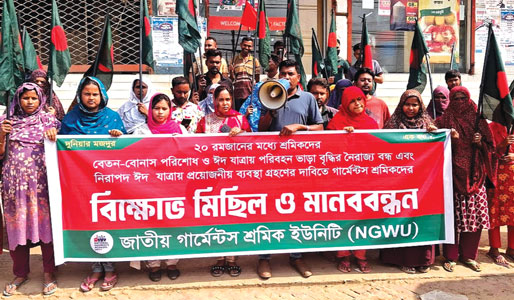 আগামী ২০ রমজানের মধ্যে শ্রমিকদের বেতন-বোনাস পরিশোধ, ঈদযাত্রায় অতিরিক্ত ভাড়া আদায় বন্ধ এবং নিরাপদ যাতায়াত নিশ্চিত করাসহ নানা দাবিতে বিক্ষোভ ও মানববন্ধন করেছেন গার্মেন্টস শ্রমিকেরা। বুধবার (৪ মার্চ) সকাল সাড়ে ১০টার দিকে আশুলিয়ার বাইপাইল মোড় এলাকায় ‘জাতীয় গার্মেন্টস শ্রমিক ইউনিট’ এর আয়োজনে এ কর্মসূচি পালন করে তারা। জাতীয় গার্মেন্টস শ্রমিক ইউনিটের নেতা-কর্মীরা জানান, ২০ রমজানের মধ্যে শ্রমিকদের বেতন-বোনাস পরিশোধ, ঈদযাত্রায় অতিরিক্ত ভাড়া আদায়, সড়কে নৈরাজ্য বন্ধসহ যানজট মুক্ত রাখার দাবিতে এসব কর্মসূচির আয়োজন করা হয়। এ সময় জাতীয় গার্মেন্টস শ্রমিক ইউনিয়নের কেন্দ্রীয় সভাপতি ফরিদুল ইসলামের সভাপতিত্বে বক্তব্য দেন আশুলিয়া থানা কমিটির সভাপতি নাজমুল হক, আশুলিয়া থানা শ্রমিক দলের সহ–সাংগঠনিক সম্পাদক মাসুদ রানা সুলতান প্রমুখ। পরে একই স্থান থেকে বিক্ষোভ মিছিল বের করা হয়। মিছিলটি বাইপাইল মোড় থেকে আশুলিয়ার বগাবাড়ী বাসস্ট্যান্ড এলাকায় গিয়ে শেষ হয়। জাতীয় গার্মেন্টস শ্রমিক ইউনিয়নের কেন্দ্রীয় সভাপতি ফরিদুল ইসলাম বলেন, ঈদ মানে আনন্দ হলেও গার্মেন্টস শ্রমিকদের মধ্যে ওই সময় নানা দুর্ভোগের শঙ্কা ও আতঙ্ক তৈরি হয়। ঈদের আগে বেতন-বোনাস পরিশোধ না করাটা গার্মেন্টস মালিকদের মধ্যে নিয়মে পরিণত হচ্ছে। এ ছাড়া ঈদের সময় বাস ভাড়ায় নৈরাজ্যের কারণে শ্রমিকদের বোনাসের টাকা অতিরিক্ত ভাড়ায় খরচ হয়। ফরিদুল ইসলামের দাবি, এ সময় চুরি, ছিনতাই, যানজট বেড়ে যায়। সরকারের কাছে আমাদের দাবি থাকবে ২০ রমজানের আগে বেতন বোনাস পরিশোধ ও এসব সমস্যা সমাধানে পদক্ষেপ নিতে হবে।