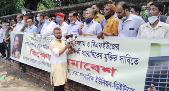 বিএফইউজে ও -ডিইউজের বিক্ষোভ সমাবেশে নেতৃবৃন্দ
