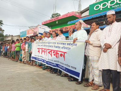 নরসিংদীর মনোহরদীতে খাদ্যবান্ধব কর্মসূচির ৪৬০ বস্তা চাল কালো বাজারে বিক্রি করার প্রতিবাদে মানববন্ধন অনুষ্ঠিত হয়েছে। বুধবার বিকেলে খিদিরপুর বাজারে স্থানীয় সচেতন নাগরিক সমাজের ব্যানারে এই মানববন্ধন করা হয়। এতে বক্তব্য রাখেন স্থানীয় আওয়ামীলীগ নেতা কাউছার রশিদ বিপ্লব, শাহাদত হোসেন বাবুল, বজলুর রহমান, অধ্যক্ষ বাকিউল ইসলাম, আবুল বাশার, আনোয়ারুজ্জামান মুকুল, আব্দুর রউফ সজিব, সাইফুল ইসলাম প্রমুখ। জানা যায়, ১০ টাকা কেজির খাদ্যবান্ধব কর্মসূচির খিদিরপুর ইউনিয়নের ডিলার মতিউর রহমান মতিন খাদ্য গোদাম থেকে ৪৬০ বস্তা চাল উত্তোলন করে স্টোরে না এনে কালো বাজারে বিক্রি করে দুবাই পালিয়ে যান। গত ৪ এপ্রিল তিনি এসব চাল উত্তোলন করেন। নির্ধারিত দিনে উপকারভোগীরা চাল নিতে আসলে এ ঘটনা প্রকাশ পায়। পরে বিষয়টি গণমাধ্যমে প্রকাশিত হলে উপজেলা নির্বাহী কর্মকর্তার(ইউএনও) নির্দেশে ডিলারের স্ত্রী ও খিদিরপুর ইউনিয়ন পরিষদের সংরক্ষিত সদস্য তাসলিমা রহমান সখি এক চাতাল মিল থেকে চাল কিনে কিছু সংখ্যক উপকারভোগীর মাঝে চাল বিতরণ করা হয়। খোঁজ নিয়ে জানা গেছে, খাদ্যবান্ধব কর্মসূচির চাল বিক্রির ডিলার মতিউর রহমানের এই ব্যবসার পার্টনার ছিলেন খিদিরপুর ইউপি চেয়ারম্যান মাহবুবুর রহমান জামিলের খালাতো ভাই নাজমুল ইসলাম এবং একান্ত সাহচর্য স্বপন মিয়া। ছয়মাস আগে ডিলার মতিন নাজমুলের কাছে তার ব্যবসার অংশিদারীত্ব বিক্রি করে দিয়েছেন। তবে নাজমুল ও স্বপন এইদায় এড়িয়ে চলতে চাইছেন। ঘটনার এতদিন পরও প্রশাসনিকভাবে কোন প্রকার আইনানুগ ব্যবস্থা গ্রহণ না করায় স্থানীয়দের মাঝে ক্ষোভ দেখা গেছে।