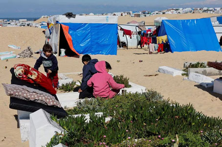 দক্ষিণ গাজার একটি কবরস্থানে সমাধিফলকের মধ্যে তিনটি শিশু বালি এবং নুড়িপাথর নিয়ে খেলছে। অন্যদিকে একটি কিশোর খালি পায়ে কবরস্থানের মধ্য দিয়ে দুই বালতি পানি বহন করে তাঁবুতে নিখোঁজ হয়ে গেছে।