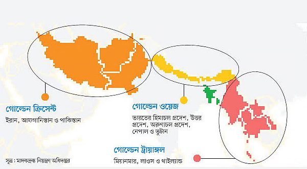 বাংলাদেশের ভৌগোলিক অবস্থান একদিকে যেমন আশীর্বাদস্বরূপ, অন্যদিকে তা আজ অভিশাপে পরিণত হয়েছে। ভারত ও মিয়ানমারের মধ্যে পড়ে বাংলাদেশের অবস্থা আজ স্যান্ডউইচের মতো। এই দুটি দেশই বিশ্বের দু’টি স্বীকৃত মাদক চক্রের