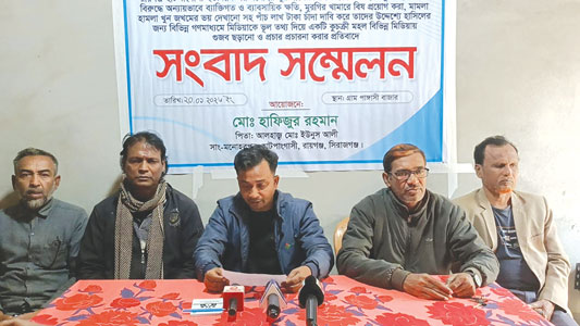 সিরাজগঞ্জের রায়গঞ্জে ব্যবসায়ী মোঃ হাফিজুর রহমান চাঁদাবাজি, মানহানি ও উদ্দেশ্যপ্রণোদিত অপপ্রচারের বিরুদ্ধে আদালতে মামলা দায়ের করেছেন। মঙ্গলবার সকালে গ্রাম পাঙ্গাসী বাজারে তিনি এ নিয়ে এক সংবাদ সম্মেলন আয়োজন করেন। মো: