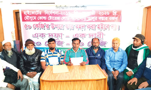 রাজশাহী কোল্ডস্টোরেজে আলু লোড-আনলোডের সময় বস্তার ওজন ৫০ কেজির বেশি বহন করানো যাবে না এই একদফা দাবিতে রাজশাহীর পবা উপজেলায় স্মারকলিপি প্রদান, সংবাদ সম্মেলন ও মানববন্ধন কর্মসূচি পালন করেছেন কুলি